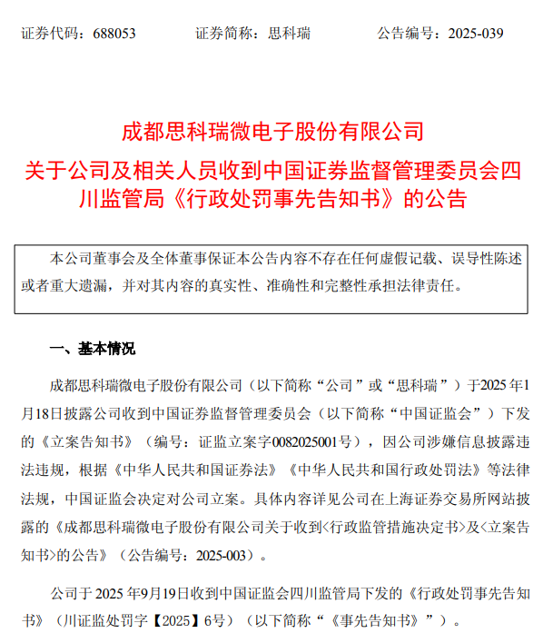 日前,成都思科瑞微电子股份有限公司(以下简称“思科瑞”)收到中国证监会四川监管局下发的《行政处罚事先告知书》(以下简称《事先告知书》)。《事先告知书》显示,思科瑞涉嫌违反《证券法》及《上市公司信息披露管理办法》相关规定,该局拟决定对公司及相关管理层人员做出相应处罚。